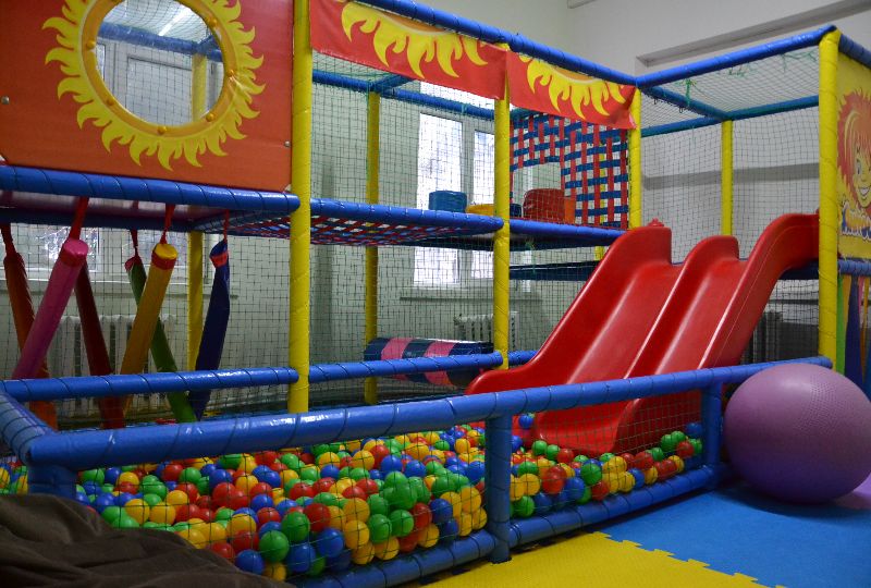 Спортивно — развлекательная площадка с горкой и сухим бассейном, приспособлениями для лазания, полосой препятствий, тоннелем, также есть разнообразные развивающие элементы и игрушки, книги, уголок творчества, которые создают благотворную среду для разностороннего развития детей.